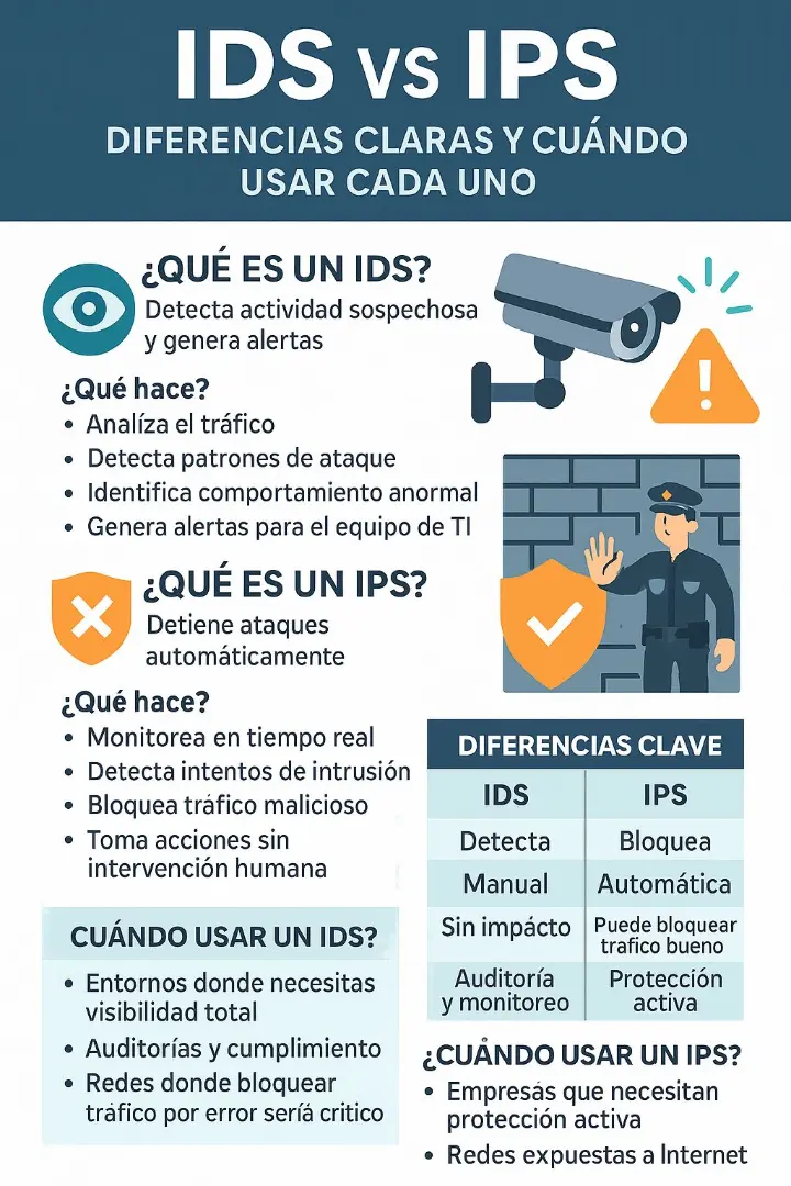 CaracterísticaIDSIPSAcciónDetectaBloqueaRespuestaManualAutomáticaRiesgo de falsos positivosSin impactoPuede bloquear tráfico buenoUso comúnAuditoría y monitoreoProtección activa